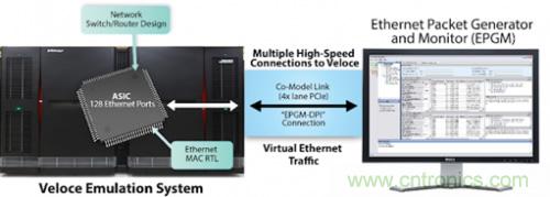 擁有成百上千個端口的設(shè)計需要與硬件擁有非常多的連接,而這些連接全都需要接線纜,這就使得在 ICE 環(huán)境中驗證網(wǎng)絡(luò)交換機和路由器設(shè)計不再可行。此外,一個128 端口的以太網(wǎng)設(shè)計等可能具有數(shù)億甚至數(shù)十億個門的尺寸。