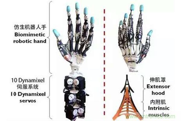 「擬人機(jī)器手設(shè)計(jì)的常規(guī)方法是,用類似鉸鏈、聯(lián)動(dòng)裝置和平衡環(huán)等零件來實(shí)現(xiàn)生物部件的機(jī)械化,從而將看似復(fù)雜的人體參照物進(jìn)行了簡化。這種方法對(duì)于理解并模仿人手的運(yùn)動(dòng)原理有一定幫助,但不可避免的制造了一些人與機(jī)械手之間的不良差異,因?yàn)槿耸稚洗蠖鄶?shù)顯著的生物力學(xué)特征都在機(jī)械化的過程中被丟棄了。這些機(jī)器手和人手生物力學(xué)在本質(zhì)上的不匹配阻礙了我們使用自然的手部運(yùn)動(dòng)來直接控制它們。因此,還沒有任何一只擬人機(jī)器人手可以達(dá)到人手的靈巧程度。」