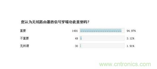 隨著Wi-Fi終端的大量普及,人們對于無線路由器的需求也越來越高,不過在此前展開的有獎調(diào)查活動中,從收集到的大約1500份反饋里,有高達94.97%的參與者認為無線路由器的信號穿墻功能相當重要??梢娙藗冊谶x擇無線路由器產(chǎn)品時,信號能否穿墻,覆蓋范圍怎么樣,已經(jīng)成為他們采購時的首要考察因素。