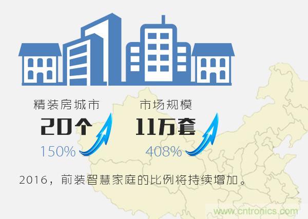 2015年各大地產(chǎn)商和物業(yè)公司都在推出智慧家庭和智慧社區(qū)的產(chǎn)品或樣板,包括花樣年、招商地產(chǎn)、金地物業(yè)、保利地產(chǎn)、萬科等。據(jù)奧維數(shù)據(jù)顯示,2015年有智能精裝房的城市達(dá)到20個,同比增長150%;市場規(guī)模達(dá)到11萬套,同比增長408%。2016年面對低迷的樓市,為了維持房價,商品房中前裝智慧家庭的比例還會增加。