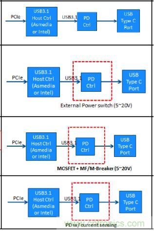 圖2:四種USB Type-C過流保護方案設(shè)計架構(gòu)