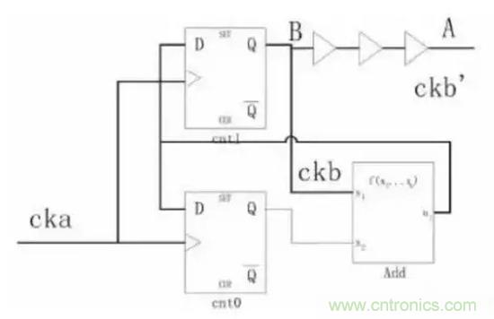 為了方便討論,時鐘樹插入以后,假設(shè)A與B之間有1個ckaCycle的skew;從圖3可以看到如果采用A點作加法器的輸入時產(chǎn)生的波形是ckb’,采用B點作為輸入時的波形是ckb,顯然,從例1的代碼來看,ckb才是正確的。因此必須注意到,如果時鐘當作普通的信號使用時可能帶來的問題,這類問題并沒有一個通用的解決辦法。在這個例子中,不采用時鐘樹上的信號才是正確的,但是在另外一些應(yīng)用中,就必須采用時鐘樹上的信號。比如,時鐘是CK的兩個觸發(fā)器中鎖存的數(shù)據(jù)再由CK的高電平和低電平選擇輸出,那么,這個時候就需要作為選擇信號的CK從時鐘樹上拉過來。因此,如果設(shè)計中用到了時鐘信號作為普通信號的情況,在后端設(shè)計時就必須特殊處理。