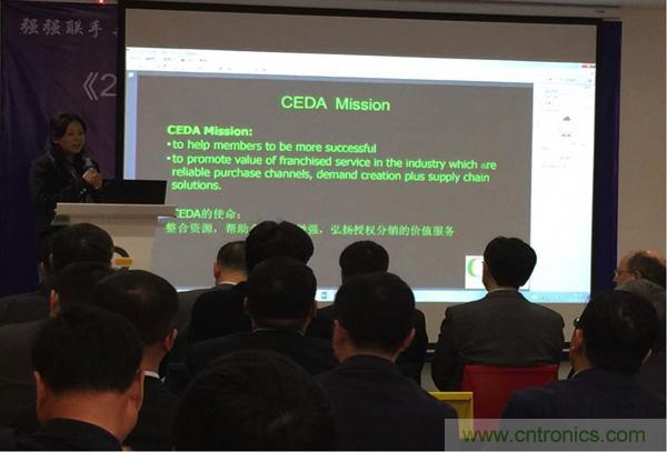 圖1:《2015中國電子授權分銷商名錄》發(fā)布會暨行業(yè)領袖峰會,CEDA常務理事Amy Wang介紹CEDA的使命