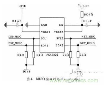 因為88E1111上集成的MDIO與C6678集成MDIO模塊進(jìn)行連接時,電壓有所差別,前者電壓為2.5 V,后者電壓為1.8 V,所以在二者之間應(yīng)該添加電壓轉(zhuǎn)換器。本文采用一片PCA9306,實現(xiàn)2.5 V和1.8 V之間的電平轉(zhuǎn)換,其連接電路如圖4所示。
