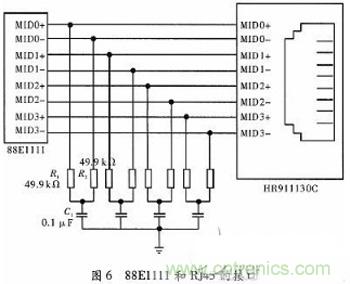 88E1111和網(wǎng)絡(luò)介質(zhì)之間無法直接連接,因傳輸速度在千兆級,所以更加需要設(shè)計合適的網(wǎng)絡(luò)隔離變壓器來降低傳輸損耗、回音和串?dāng)_。本文選擇千兆網(wǎng)口插座HR911130C,該插座內(nèi)部自帶變壓器電路,只需在外部連接濾波網(wǎng)絡(luò)便可實現(xiàn)網(wǎng)絡(luò)信號穩(wěn)定地傳輸,如圖6所示。88E1111和 HR9111130C采用差分連接,在PCB布線時需要嚴(yán)格等長,且一般還需使用阻抗匹配網(wǎng)絡(luò),如圖6中的R1和C1。