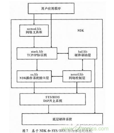 NDK的基本結(jié)構(gòu)如圖7所示,可看出NDK開發(fā)套件與用戶程序、SYS/BIOS操作系統(tǒng)和底層硬件都有密切的聯(lián)系。NDK中網(wǎng)絡(luò)控制層和操作系統(tǒng)接口層與SYS/BIOS系統(tǒng)相連接,NDK的硬件驅(qū)動層用于控制底層硬件驅(qū)動的配置,這些操作和配置均可在網(wǎng)絡(luò)工具庫中找到相應(yīng)的驅(qū)動函數(shù),并可直接由用戶應(yīng)用程序來調(diào)用實現(xiàn)。