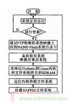 本設(shè)計(jì)對(duì)uboot和Linux內(nèi)核進(jìn)行改造,使其支持YAFFS2文件系統(tǒng),對(duì)系統(tǒng)添加ftp、telnet等應(yīng)用服務(wù)。系統(tǒng)更新流程如圖2所示。系統(tǒng)正常運(yùn)行時(shí)管理人員可以通過telnet遠(yuǎn)程登錄到嵌入式終端進(jìn)行監(jiān)控和管理。當(dāng)需要對(duì)系統(tǒng)進(jìn)行更新時(shí),通過遠(yuǎn)程管理系統(tǒng)的ftp客戶端登錄到嵌入式終端,將需要更新的內(nèi)核映像和文件系統(tǒng)上傳到NAND Flash。上傳完畢后對(duì)原有的內(nèi)核映像和文件系統(tǒng)進(jìn)行備份并重啟系統(tǒng)。系統(tǒng)重啟后uboot將NAND Flash中更新后的內(nèi)核映像和文件系統(tǒng)搬運(yùn)到SDRAM中,然后跳轉(zhuǎn)到SDRAM中啟動(dòng)Linux系統(tǒng),掛載YAFFS2文件系統(tǒng),啟動(dòng)各種應(yīng)用服務(wù)。