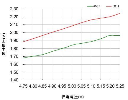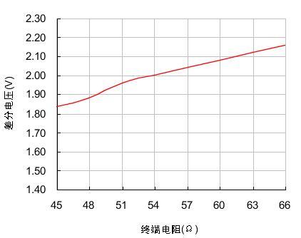 差分電壓除負(fù)載電阻的影響外,還會受到供電電壓的影響,如圖 2我們測試了CTM1051M模塊在不同電壓,不同負(fù)載下的差分電壓幅值,可以看到電源電壓升高0.5V,差分電壓幅值會升高約0.3V。