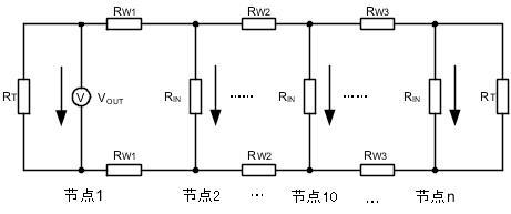 圖 4中,各節(jié)點(diǎn)的RW、RIN難以準(zhǔn)確確定,組網(wǎng)時(shí)以公式計(jì)算較為繁瑣,簡便的方法便是測量總線兩端的節(jié)點(diǎn)電壓。如網(wǎng)絡(luò)的總線電阻過大時(shí),節(jié)點(diǎn)1到節(jié)點(diǎn)n總線對信號的損耗會很大,當(dāng)節(jié)點(diǎn)n接收的差分電壓低于1.2V時(shí),需要增大終端電阻。