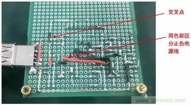 對(duì)于萬(wàn)能板的焊接方法,一般是利用前面提到的細(xì)導(dǎo)線進(jìn)行飛線連接,飛線連接沒(méi)有太大的技巧,但盡量做到水平和豎直走線,整潔清晰如下圖。