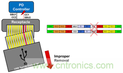 新型USB Type-C連接器除了用于USB Type A或Micro-USB連接器的標(biāo)準(zhǔn)靜電放電(ESD)保護(hù)外,還具有挑戰(zhàn)性的保護(hù)考慮。由于USB Type-C連接器的管腳間距如此之小,因此可能會(huì)將高電壓VBUS電源管腳短路到附近的數(shù)據(jù)管腳。而且由于通過VBUS電源傳送(PD),VBUS電源管腳可達(dá)到20V,5A,因此將VBUS短路到配置通道(CC)或邊帶使用(SBU)管腳對(duì)下游PD控制器來(lái)講將是災(zāi)難性的,因?yàn)镻D控制器并不能處理這些管腳上的較高電壓(圖1)。