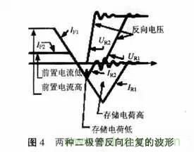 圖4是存儲電荷高或低的兩種二極管電流、電壓波形。從圖中可以看出存儲電荷少時,反向電壓的斜率大,并且會產(chǎn)生有害的振動。而前置電流低則存儲電荷少,即在空載或輕載時是最壞條件。所以進行優(yōu)化驅(qū)動電路設(shè)計時應(yīng)著重考慮前置電流低的情況,即空載或輕載的情況,應(yīng)使這時二極管產(chǎn)生的振動在可接受范圍內(nèi)。