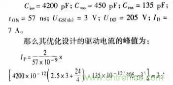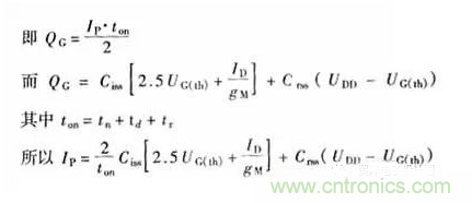 UGS第一段是快速上升到門限電壓;UGS第二段是比較緩的上升速度以減慢漏極電流的上升速度,但此時的UGS也必須滿足所需的漏極電流值;UGS第四段快速上升使漏極電壓快速下降;UGS第五段是充電到最后的值。當然,要得到完全一樣的驅(qū)動波形是很困難的,但是可以得到一個大概的驅(qū)動電流波形,其上升時間等于理想的漏極電壓下降時間或漏極電流上升的時間,并且具有足夠的尖峰值來充電開關(guān)期間的較大等效電容。該柵極尖峰電流IP的計算是:電荷必須完全滿足開關(guān)時期的寄生電容所需。