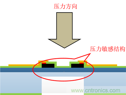 當壓力敏感結(jié)構(gòu)受到氣壓壓力時,壓敏電阻的阻值發(fā)生變化,進而引起輸出電壓Vout發(fā)生變化,通過輸出電壓值與壓敏電阻的阻值變化的關(guān)系,實現(xiàn)壓力值的測量。