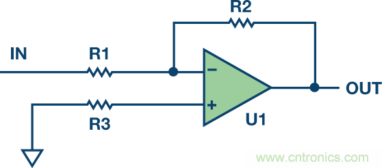在同相接地輸入端增加一個與輸入電阻R1和反饋電阻R2的并聯(lián)組合相等的電阻(圖1中的R3),可以讓阻抗相等。做一些計算可以證明,誤差降至Ioffset × R feedback 。由于I offset 為I bias 的10%到20%,所以這會有助于降低輸出失調誤差。