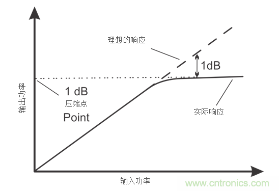 第二種規(guī)格,輸出1dB壓縮點(diǎn),實(shí)際上非常類似于最大線性輸出電壓和電流的概念。它也被稱為P1dB,在該點(diǎn)上,放大器從理想狀態(tài)下增益壓縮到1分貝的輸出功率級。圖1介紹了該概念,其中,實(shí)線表示測得的信號(hào),虛線表示理想的信號(hào)。有時(shí),一些測量將P1dB點(diǎn)與輸入而非輸出對照,這應(yīng)在計(jì)算中予以考慮。