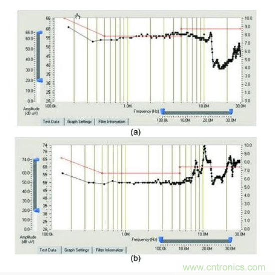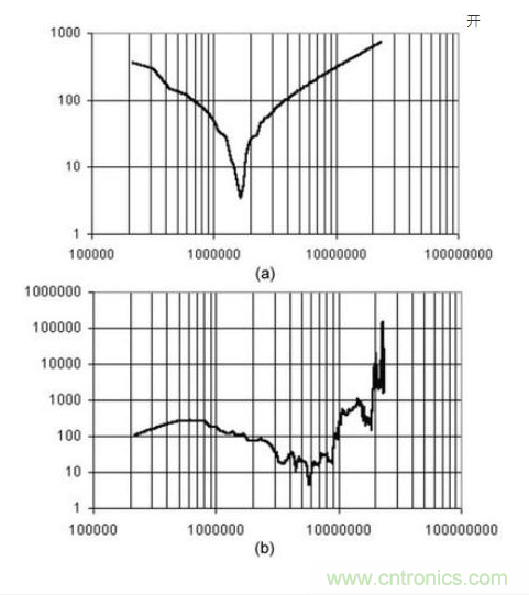 上面的例子說明,選擇一個具有很高插損的濾波器也不能很好抑制傳導噪聲的原因是,電源輸入端阻抗的影響。因此,設計者除了選擇一個合適的濾波器之外,還需要了解電源的阻抗特性、共模阻抗和差模阻抗。阻抗測試可以借助專用的阻抗測試儀或者傳導分析儀。一種濾波器的共模阻抗(a)和差模阻抗(b)的變化如圖5所示。