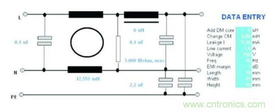 知道設備的干擾特性和輸入阻抗特性后,設計或者選擇一個濾波器就變得簡單了。如果使用一個現(xiàn)成的濾波器,可以調用過去積累的濾波器數據庫,比對濾波器參數,找到一個合適的濾波器。如果沒有合適的或者想專門設計一個專用濾波器,可以借助專用的濾波器設計軟件。在確定一個濾波器模式后輸入濾波器一些簡單的約束條件,設計軟件根據阻抗特性自動計算出最合適的組件值,以及提供最合適的衰減。(如圖6所示)