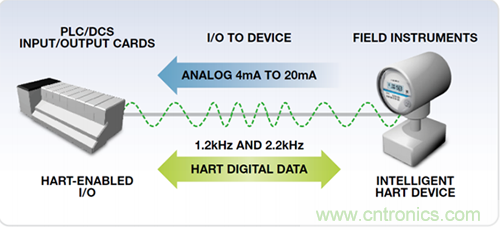 自工業(yè)革命早期以來,人們就需要使用機械和設(shè)備進行測量、控制和通信,采用傳感器和執(zhí)行器的儀表系統(tǒng)成為現(xiàn)代制造工廠的支柱。通過傳輸線路,采用 4 mA 至 20 mA 模擬電流信號進行傳輸數(shù)據(jù)以及設(shè)置的通信方式長期以來一直在廣泛使用。但儀表也在日臻成熟,從早期的純模擬系統(tǒng)發(fā)展到當(dāng)前使用的“智能”系統(tǒng),利用 HART®(可尋址遠(yuǎn)程傳感器高速通道)協(xié)議等技術(shù)增強了通信功能。簡而言之,直流低頻電路信號由獨立的更高頻率信號進行調(diào)制,信號在一對頻率之間切換(圖 1)—這種技術(shù)稱為頻移鍵控(FSK)。