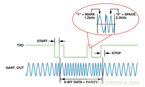 圖 2 顯示了調(diào)制涉及的主要模塊:FSK直接數(shù)字合成 (DDS)引擎、DAC(開關(guān)電阻串類型)和緩沖區(qū)。要發(fā)送的數(shù)字?jǐn)?shù)據(jù)通過UART輸入。調(diào)制器通過將RTS(請求發(fā)送)信號拉低來使能。調(diào)制器將TXD輸入端的UART編碼HART數(shù)據(jù)位流轉(zhuǎn)換成一系列二進制 1200 Hz(“1”)和 2200 Hz(“0”)信號音(見圖 3)。DDS在任何一種頻率下生成正弦數(shù)字字流,DAC將其轉(zhuǎn)換為大約 493 mV的p-p模擬正弦波。此正弦波信號在內(nèi)部進行緩沖并在HART_OUT引腳上輸出。該DDS引擎本身會產(chǎn)生連續(xù)相位信號,因此在頻率之間切換時避免了出現(xiàn)任何輸出不連續(xù)。在HART_OUT上進行內(nèi)部緩沖的主要優(yōu)勢是產(chǎn)生很高的驅(qū)動能力,無需外部模擬緩沖,也不會出現(xiàn)它們帶來的問題。HART_OUT引腳直流偏置至 0.75 V,并應(yīng)容性耦合至負(fù)載。有關(guān)更多詳細(xì)信息,請參見AD5700/AD5700-1 數(shù)據(jù)手冊。