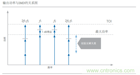 在許多器件的線性工作區(qū)域中,一階音和三階失真產(chǎn)物的比率常常很高。然而,隨著基音輸入功率的增加,三階失真產(chǎn)物也隨之增加。實(shí)際上,基音的功率每增加1 dB,互調(diào)失真產(chǎn)物會(huì)增加3 dB。