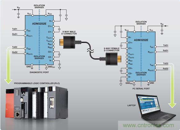 要在惡劣的工業(yè)環(huán)境下實現(xiàn)魯棒的數(shù)據(jù)通信鏈路,RS-232 診斷端口必須在 RS-232 電纜網(wǎng)絡與相連系統(tǒng)之間提供一個隔離接口,以預防高噪聲環(huán)境中的電壓尖峰和接地環(huán)路并提高系統(tǒng)穩(wěn)定性(圖 1).RS-232 通信鏈路的電源隔離利用隔離式 DC/DC電源或 ADI 公司的 isoPower®集成式 DC/DC 轉(zhuǎn)換器技術實現(xiàn)。
