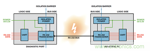 要提供隔離式 RS-232 通信接口,兩端的器件必須與所連的RS-232 電纜相互隔離。要隔離數(shù)據(jù)鏈路,則必須對數(shù)據(jù)信號線路和用于驅(qū)動該電纜的電源進行隔離。來自診斷端口上UART 的數(shù)據(jù)需要跨越隔離柵并傳輸至隔離總線側(cè)上的RS-232 收發(fā)器。本地 5 V/3.3 V 電源也需要跨越隔離柵來為隔離總線側(cè)上的 RS-232 收發(fā)器供電。工業(yè) PC 端也同樣需要如此:數(shù)據(jù)和電源均需要跨越隔離柵(圖 3).通過將器件與 RS-232 電纜網(wǎng)絡隔離開來,診斷端口和工業(yè) PC電路均受到保護,不受惡劣環(huán)境下可能耦合到 RS-232 電纜上的瞬變影響。隔離還可以中斷因診斷端口和工業(yè) PC 端存在不同接地電位而可能出現(xiàn)的接地環(huán)路。RS-232 總線上可能出現(xiàn)的高共模電壓不能跨越隔離柵,從而保護隔離數(shù)據(jù)的用戶。