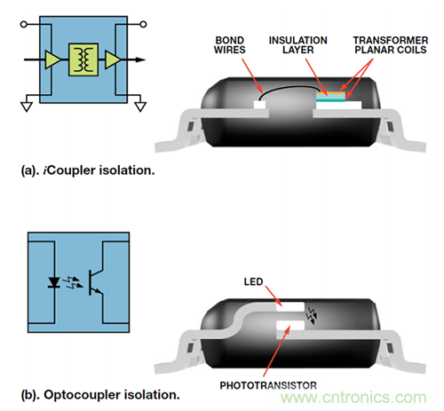 圖 4 比較了兩種主要隔離技術。iCoupler 技術(圖 4(a))利用厚膜工藝技術構建可實現(xiàn) 2.5 kV 隔離的微型片上變壓器,從而在 RS-232 系統(tǒng)中提供信號隔離。較古老但廣泛采用的光耦合器解決方案(圖 4(b))則采用發(fā)光二極管(LED)和光電二極管。LED 用于將電信號轉(zhuǎn)換為光,光電檢測器則用于將光轉(zhuǎn)換回為電信號。電光轉(zhuǎn)換本身的低轉(zhuǎn)換效率導致功耗相對較高;光電檢測器的慢速響應則限制其速度;而老化問題會限制其使用壽命。
