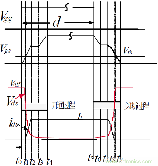 -- [t0-t1]區(qū)間,MOSFET 的GS 電壓經(jīng)Vgg 對Cgs充電而上升,在t1時刻,到達(dá)維持電壓Vth,MOSFET 開始導(dǎo)電;