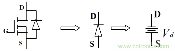 即內(nèi)部二極管的等效電路,可用一電壓降等效,此二極管為MOSFET 的體二極管,多數(shù)情況下,因其特性很差,要避免使用。