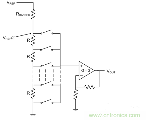 電阻串 DAC 設(shè)計(jì)最終、最微妙的元件是位于串電阻器及接點(diǎn)之前的分壓器。該電阻器電阻等于串中其余電阻器的等效阻抗,能有效將參考輸入減半。這樣做的目的是降低輸出緩沖器的共模輸入要求,并在實(shí)現(xiàn)良好性能的同時(shí)幫助保持低成本。為了對(duì)此進(jìn)行補(bǔ)償,輸出緩沖器一般采取 2 倍的非反相增益,盡管有時(shí)反饋電阻器通過數(shù)字控制實(shí)現(xiàn)不同增益。