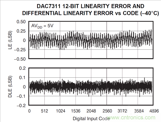 每個(gè)電阻器值的精確度可直接決定線性度。如果電阻串中任何一個(gè)電阻器的值不合適,我們就會(huì)在代碼轉(zhuǎn)換時(shí)發(fā)現(xiàn)相對(duì)于該電阻器的不良微分非線性度 (DNL)。此外,所有后續(xù)代碼的積分非線性度 (INL) 也會(huì)因?yàn)椴黄ヅ涠a(chǎn)生失調(diào)。由于典型電阻串 DAC 設(shè)計(jì)中的電阻器數(shù)量龐大,我們不可能對(duì)每個(gè)電阻器都進(jìn)行調(diào)整,因此只能接受一定程度上的 DNL 誤差。然而,仍然必須維持良好的 INL 性能,因此可經(jīng)常對(duì)各組電阻器實(shí)施區(qū)域化調(diào)整,以避免調(diào)整每個(gè)電阻器,其在以下 INL 圖中呈“階梯”狀。