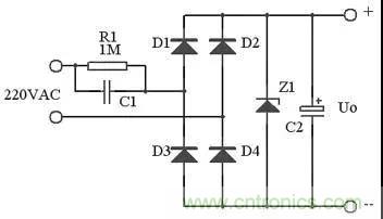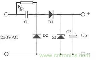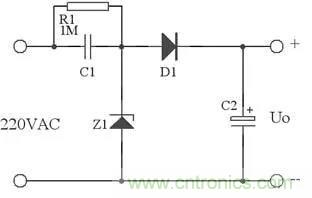 在實際應(yīng)用中,可以用下圖代替上圖,這里用了Z1正向特性和反向特性,其反向特性(也就是其穩(wěn)壓特性)來穩(wěn)定電壓,其正向特性用來在市電負半周給C1提供放電回路。