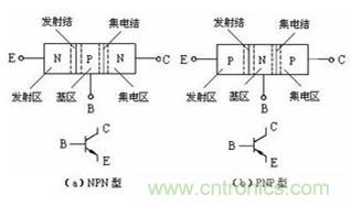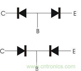 2.發(fā)射結(jié)和集電結(jié)都是屬于pn結(jié),具備pn結(jié)的特性,因此其結(jié)構(gòu)相當于一個極(陰極和陰極或者陽極和陽極)并聯(lián)在一起的兩個二極管,這個公共的電極就是基極,而另外兩個極就是集電極和發(fā)射極;見圖二,上面的對應(yīng)的是npn型三極管,下面的對應(yīng)的是pnp型三極管;