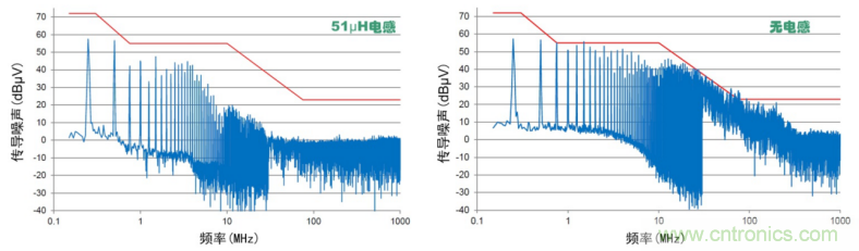 對(duì)于CAN接口的EMC問(wèn)題,除了選用更好性能,符號(hào)要求的CAN收發(fā)芯片,另一種簡(jiǎn)單的方法就是對(duì)CAN接口增加外圍,共模電感是一種很好的選擇。在現(xiàn)有汽車電子CISPR 25標(biāo)準(zhǔn)中,對(duì)傳導(dǎo)騷擾限值有很嚴(yán)格要求。許多CAN收發(fā)器均會(huì)超過(guò)限值。如圖 5分別為按照車規(guī)限制測(cè)試增加和不加共模電感的CAN接口傳導(dǎo)騷擾,共模電感值為51μH,可以看到在各個(gè)頻段下對(duì)噪聲改善較為明顯,測(cè)試結(jié)果仍有很大裕量。