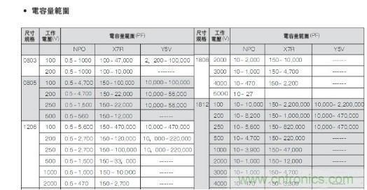 容量與電壓和尺寸的范圍關(guān)系表
