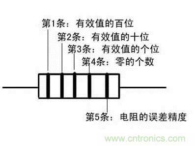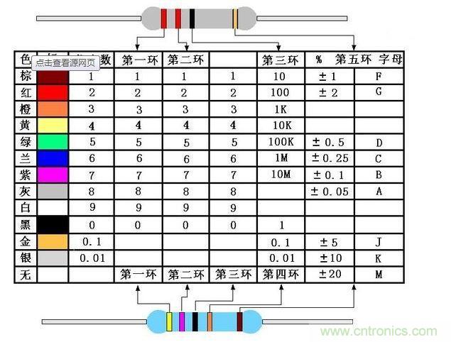 電阻器上用不同顏色的環(huán)來表示電阻的標(biāo)稱阻值,常見的電阻器有四色環(huán)電阻和五色環(huán)電阻。四色環(huán)電阻,一般是碳膜電阻,用三個(gè)色環(huán)來表示阻值,用一個(gè)色環(huán)表示誤差。五環(huán)電阻一般是金屬膜電阻,精度更高,常用四個(gè)色環(huán)表示阻值,另一個(gè)色環(huán)表示誤差。