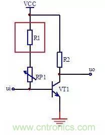 電阻R1用來限制電路中電流,防止可變電阻器阻值調(diào)到最小時(shí),使得三極管VT1基極電壓等于電源電壓VCC,那樣會(huì)因?yàn)閂T1基極電流太大而損壞VT1,這種電阻在電路中一般稱為保護(hù)電阻。