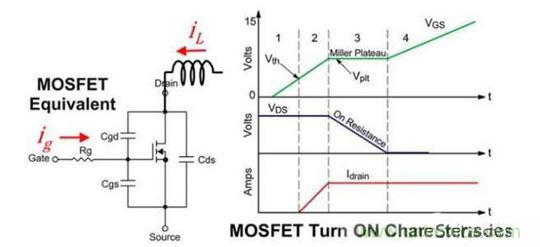這里就用MOSFET代替BJT了,所以ids = ic,Vds=Vce,Coss也就是Cds代表輸出電容。簡單來說就是當MOS管一開始導通時輸出電容Coss還保持Vds電壓,隨著Ids電流越來越大,Vds電壓終于保持不住,開始下降。直到管子完全開啟。比較詳細的開啟過程是由Miller Plateau造成的,這里借用了網(wǎng)上一些解釋Miller Plateau的圖,如果有不清楚的就請見諒了。