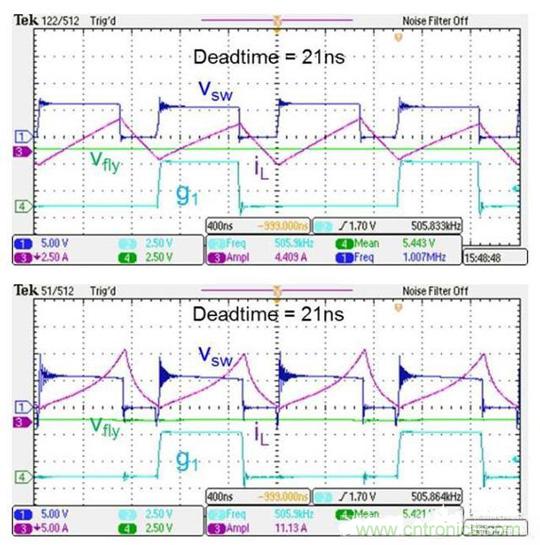 同理對于Q2開啟時,如果電感電流為正,那么當我們首先關閉Q1管時,Vsw就會被電感電流拉低到0,因為iL》0, Q2的Coss會discharged到0,然后我們再開啟Q2,就可以達到ZVS了。這里我有一張其他Topology的PWM converter的波形圖,也和buck工作原理類似,大概可以看看基本原理,也就是電感電流為負時,Q1可以實現(xiàn)ZVS,讓Vsw的ringing比較小。而當電感電流為正時,實現(xiàn)不了ZVS,Vsw的ringing就比較大了。