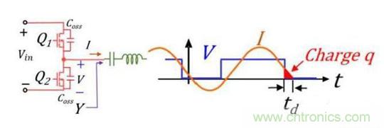 這是因為如果電流I是滯后與電壓V的,這樣在Q1開啟之前電流I為負值就會charge Q2的Coss,同時discharge Q1的Coss,讓V到Vin,這樣Q1就實現(xiàn)ZVS turn on了。Q2開啟之前,電流I為正,也會discharge Q2的Coss,和charge Q1的Coss,讓V到0,這樣Q2就實現(xiàn)ZVS了。