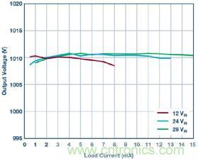 圖 6:圖 4 所示解決方案在各種不同輸入電壓條件下的負載調(diào)節(jié)性能。