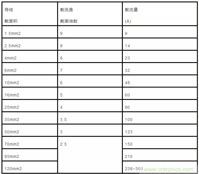 2.5mm’及以下的各種截面鋁芯絕緣線,其載流量約為截面數(shù)的9倍。如2.5mm’導(dǎo)線,載流量為2.5×9=22.5(A)。從4mm’及以上導(dǎo)線的載流量和截面數(shù)的倍數(shù)關(guān)系是順著線號往上排,倍數(shù)逐次減l,即4×8、6×7、10×6、16×5、25×4。