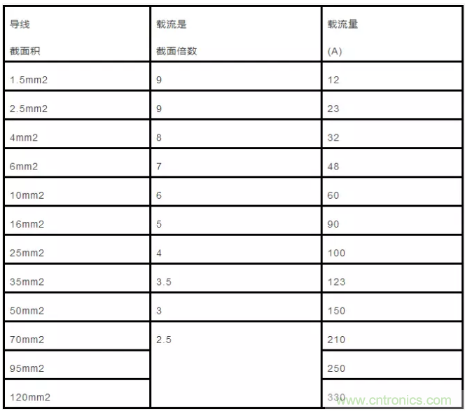 嚴格要求就用導(dǎo)線截面積乘以4作為載流量。載流量小,導(dǎo)線就要得多,成本就高。為了降低成本,又保證安全,很多家裝在不是封閉布線時就采用導(dǎo)線截面積乘以5倍或者6倍來提高導(dǎo)線的載流量。