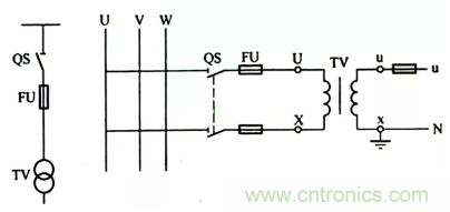 單相電壓互感器一次側(cè)端子為U、X,二次側(cè)為u、x;三相電壓互感器一次側(cè)端子為U、V、W,二次側(cè)為u、ⅴ、w、0。電壓互感器具有首端標志u的端子應(yīng)和儀表的相線端連接,末端x接地并與儀表中性線端連接。