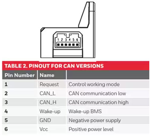 圖 3:BAS 系列傳感器的引腳布局包括電源、接地、請求和喚醒信號,以及差分 CAN 總線信號。(圖片來源:Honeywell Sensing and Productivity)