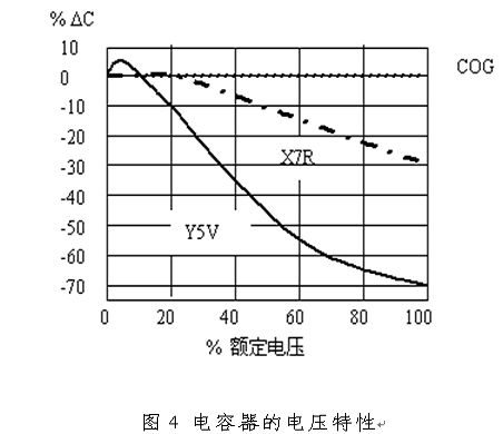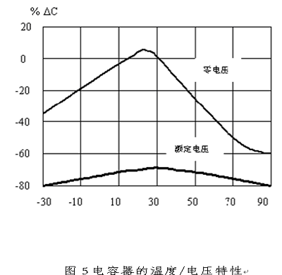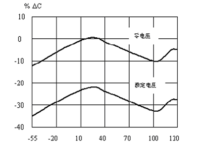 從圖中可以看到,COG電容器的容量幾乎隨溫度沒有變化,X7R電容器的容量在額定工作溫度范圍變化12%以下,Y5V電容器的容量在額定工作溫度范圍內變化70%以上。這些特性是必須注意的,否則會出現(xiàn)濾波器在高溫或低溫時性能變化而導致設備產(chǎn)生電磁兼容問題。