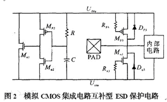 數字電路一般采用兩級保護電路,并且在主保護電路和次保護電路中串聯一個限流電阻,而大的限流電阻和ESD 鉗位器件的節(jié)電容會產生一個大的RC 延遲,因此,不適合應用于高速模擬CMOS集成電路中。