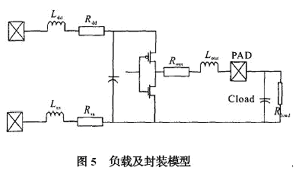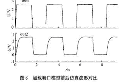 由于ESD 保護電路以及封裝所帶來的寄生電容和寄生電感對原有輸出信號會有影響,尤其是在高速模擬電路中,頻率越高信號畸變越嚴重,所以建立合適的仿真模型并進行有效的仿真是必須的。信號一般經過驅動, ESD 保護,和封裝引線才能傳到芯片外的負載上,封裝的模型根據選用的封裝形式和廠家提供的參數決定。 一般IC 封裝會給出端口的寄生電容,電阻和電感,其等效模型如圖5所示。 將該模型與前面的ESD 保護電路(圖3) 串連起來就可以得到端口模型, 可用spice 對用于USB2.0 的環(huán)境,在480 MHz 頻率下的收發(fā)電路進行仿真,其仿真波形如圖6 所示。 輸出端口out1 是不考慮端口模型的影響,480 MHz 時鐘的輸出較為理想,out2 是加入端口模型后的時鐘輸出,波形有所畸變,但仍能滿足電路設計要求。