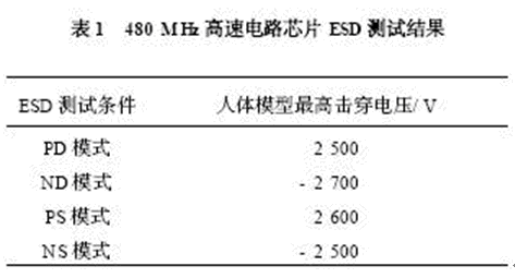 上述ESD 保護電路(見圖3) 在被應用于設計USB2. 0 接口芯片中。 該芯片的最高時鐘頻率為480 MHz ,采用TSMC 公司的0. 25μm 混合信號工藝進行了流片。 流片后的芯片用抗靜電測試儀( Thermo Keytek 公司,型號: ZAPMASTER 714)進行了測試,其結果如表1 所示,給出了在上述4 種不同的放電模式下的耐壓值。 測試結果表明在所有測試條件下的人體模型最高擊穿電壓(V) 超過了正負2 500 V。